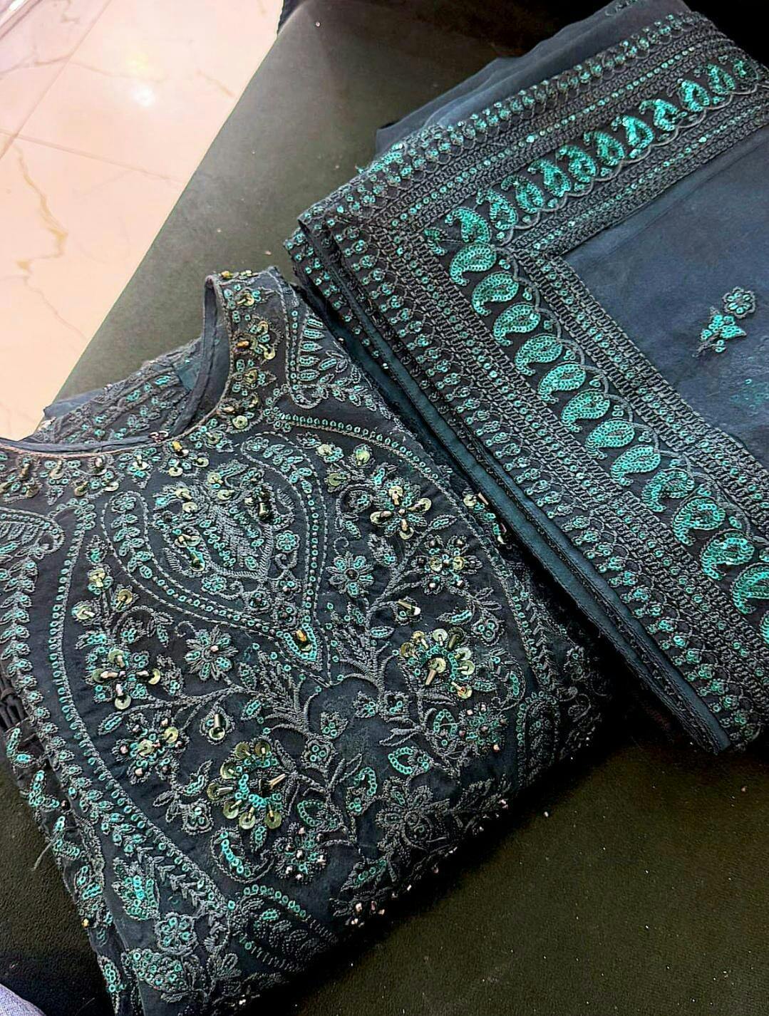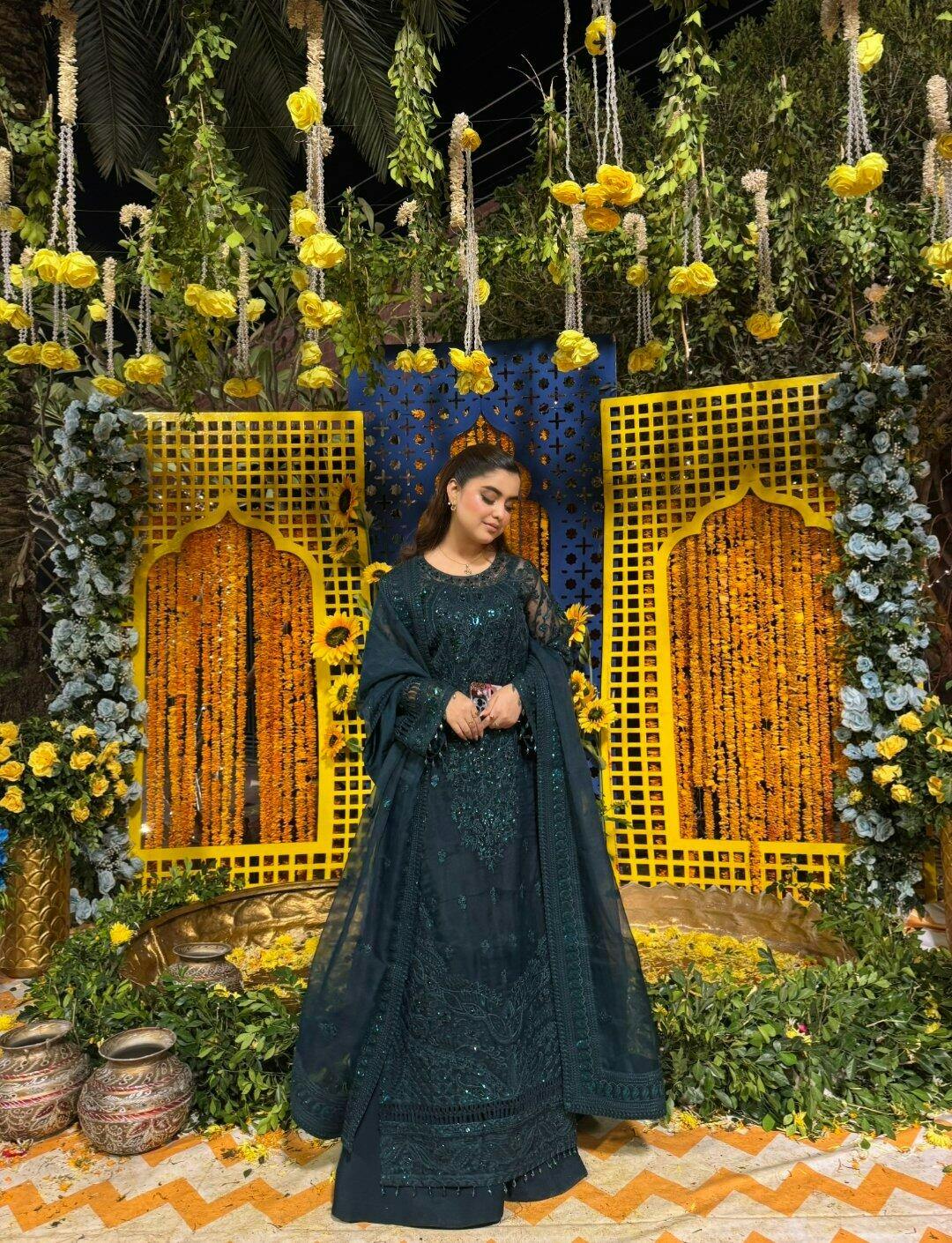 Step into timeless elegance with Mahjabeen, an enchanting ladies luxury formal dress in a rich teal hue. Beautifully hand-embellished, this exquisite ensemble showcases exceptional craftsmanship and regal sophistication. The deep, elegant color enhances the intricate detailing, creating a look that’s both graceful and captivating. Perfect for weddings, festive soirées, and grand celebrations, Mahjabeen is a true symbol of luxury, charm, and refined style.
